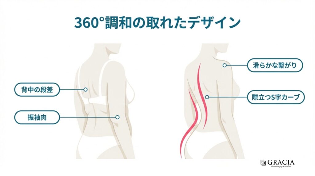 私たちは、普段自分の「後ろ姿」を意識する機会がどれだけあるでしょうか。鏡で見るのは、ほとんどが正面の姿。しかし、他人からは、意外なほど後ろ姿を見られています。ブラジャーの上に乗っかる背中の脂肪、寸胴に見えてしまう腰回りのライン、そして、自信の持てないヒップライン。これらの悩みは、自分では見えないからこそ、ふとした瞬間に気になってしまう、厄介な存在です。