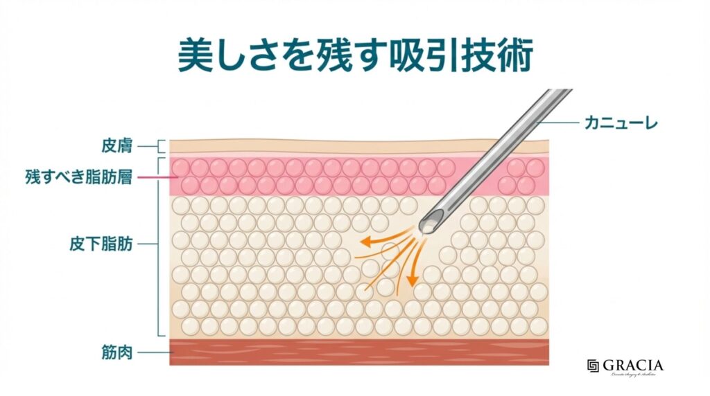 「脂肪を全部取れば、一番細くなる」というのは、実は大きな誤解です。皮膚のすぐ下には、体を滑らかに見せるために必要な、薄い脂肪の層があります。この層まで根こそぎ取ってしまうと、皮膚が筋肉に張り付いてしまい、表面がデコボコになったり、不自然な筋張った見た目になったりしてしまいます。美しい仕上がりとは、適度な脂肪が、あるべき場所に、滑らかに残っている状態なのです。脂肪吸引は、量を競う競技ではありません。