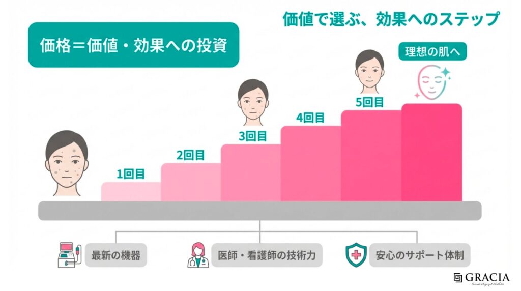 高額な美容液を何本も試すことを考えれば、専門家の管理のもとで確実な結果を目指すこの投資は、決して高すぎるとは言えないかもしれません。大切なのは、1回の安さに惑わされず、「ゴールまでの総額」を常に意識することです。