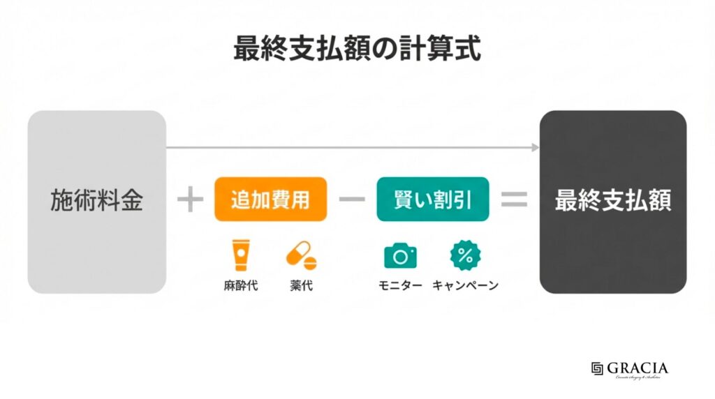 クリニックのウェブサイトに表示されている「ルメッカ顔全体 25,000円」という価格。これだけを見て、「よし、予算内だ」と安心してしまうのは少し早いかもしれません。多くの場合、施術料金の他にも、いくつかの追加費用が発生する可能性があります。後から「こんなはずじゃなかった!」と慌てないためにも、事前にどんな費用がかかるのかを把握しておきましょう。
