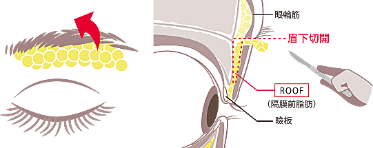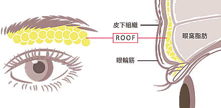 患者様の症状で、まぶたの厚みやたるみがより強い場合は、ROOF(隔膜前脂肪)・眼窩脂肪を除去することもございます。