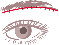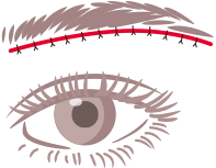 除去した後、傷跡が目立たないよう丁寧に縫合していきます。この時、縫合の糸が眉毛の下から出てこないよう皮下と骨膜とで固定する場合がございます。